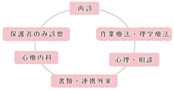 京都市児童福祉センターの連携医療機関として、市内の発達障害をもつお子さんが受けられる療育等の福祉サービスや、同センターで実施されている学習会のご案内、療育手帳・精神手帳や種々の手当に関わる診断書についてのご相談をお受けします。
